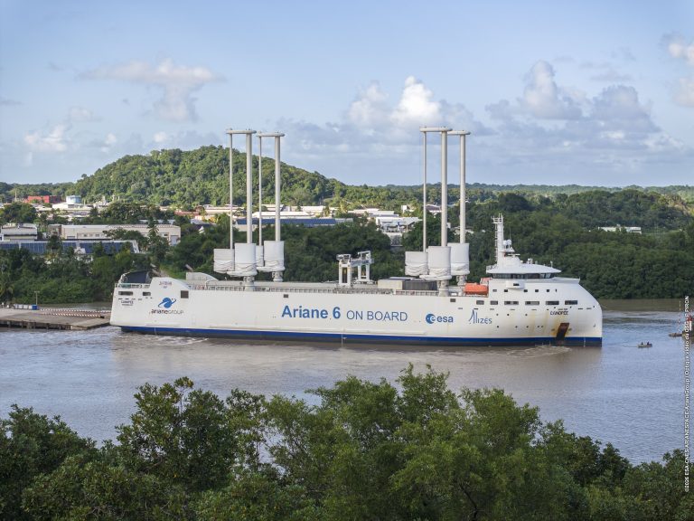 Les étages de la première Ariane 64 sont arrivés en Guyane française, à l’issue de leur traversée transatlantique à bord de Canopée, le navire hybride à voiles chargé de transporter les étages d’Ariane 6 depuis l’Europe continentale jusqu’à Kourou.