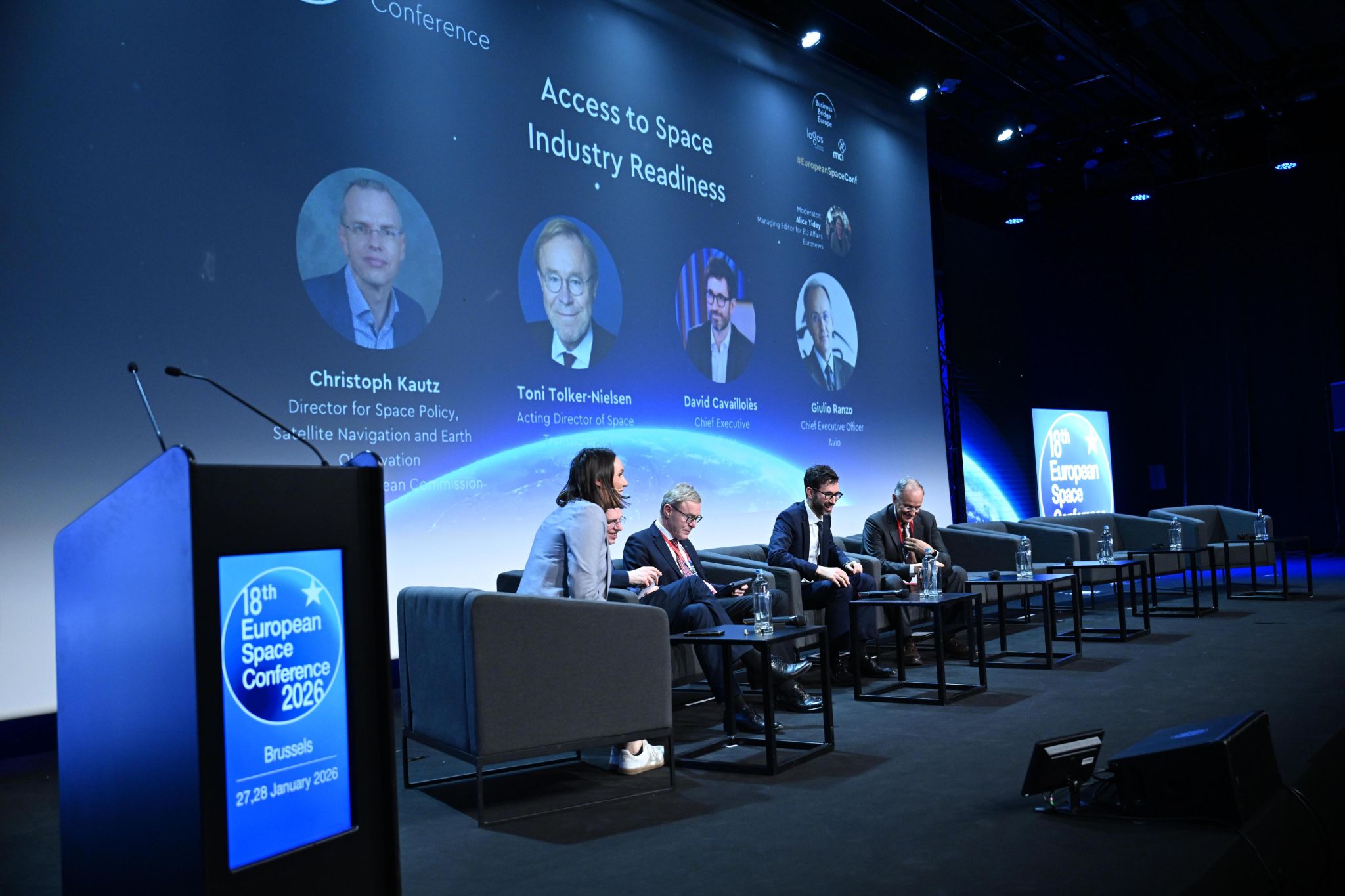 Moderator: Alice Tidey, Managing Editor for EU Affairs at Euronews // Panelists: Christoph KAUTZ, Director, Satellite Navigation and Earth Observation, DG DEFIS; Toni TOLKER-NIELSEN, Acting Director of Space Transportation, ESA; David Cavaillolès, CEO, Arianespace; Giulio RANZO, CEO, AVIO.